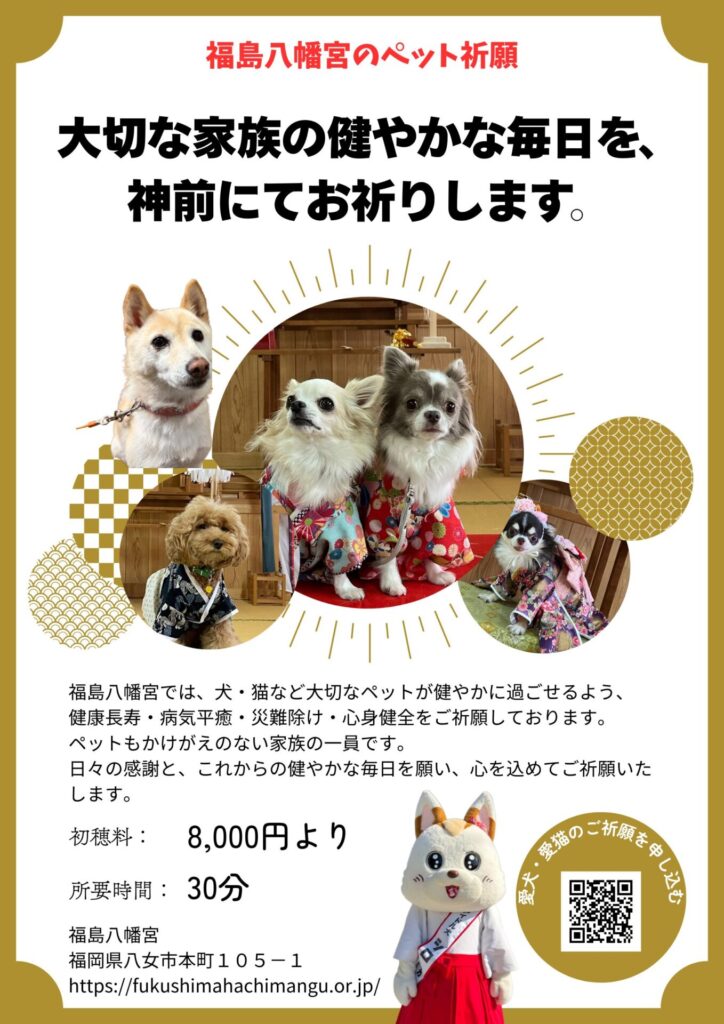 福島八幡宮では、犬・猫をはじめとする大切なペットの健康長寿・病気平癒・災難除けをお祈りしております。